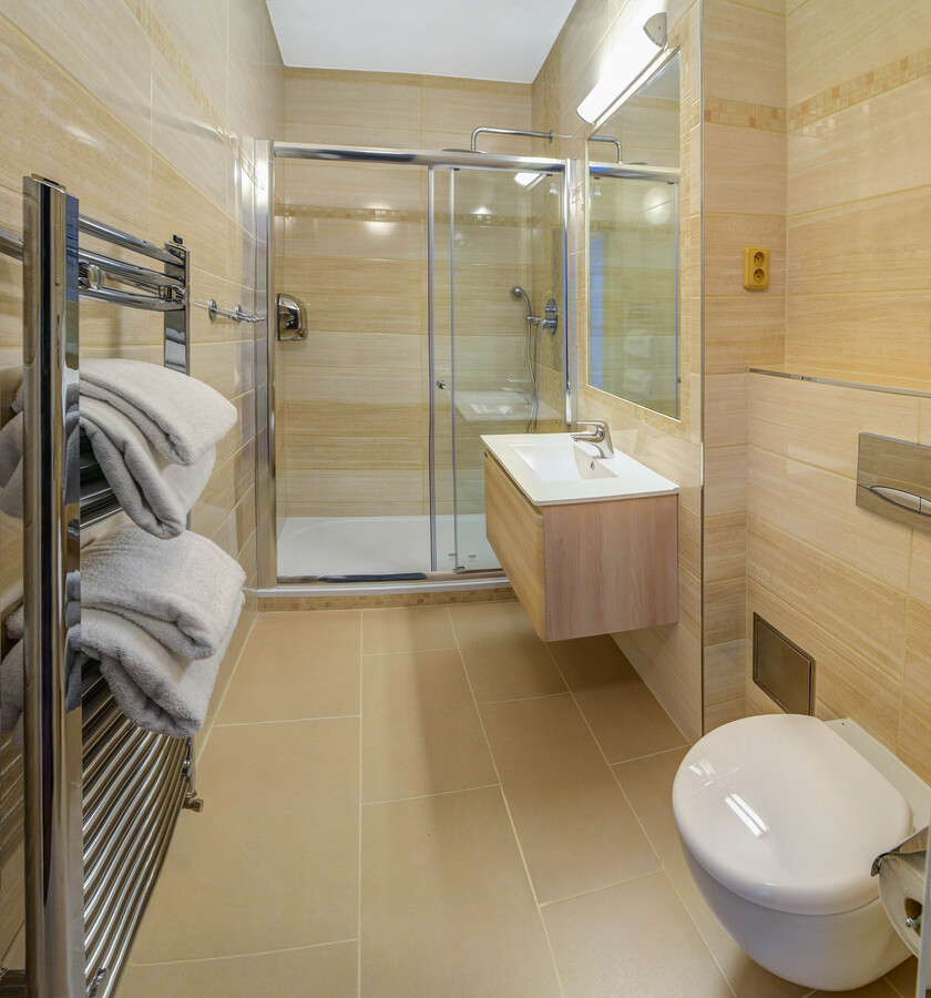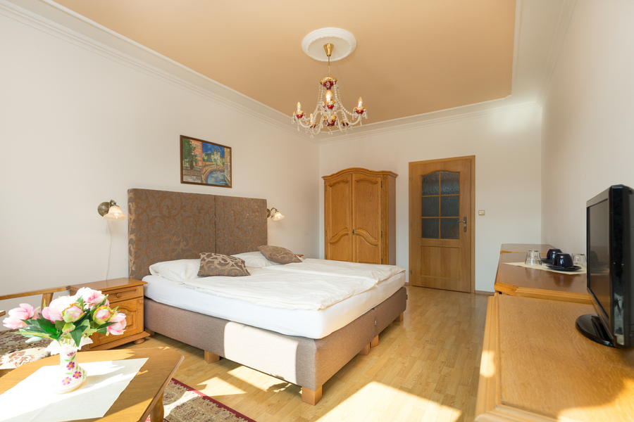 Postel (180x200 cm nebo dvě postele, každá 90x200 cm), Wi-Fi (zdarma), TV, balkon (v některých pokojích), lednička, fén, telefon, sprcha